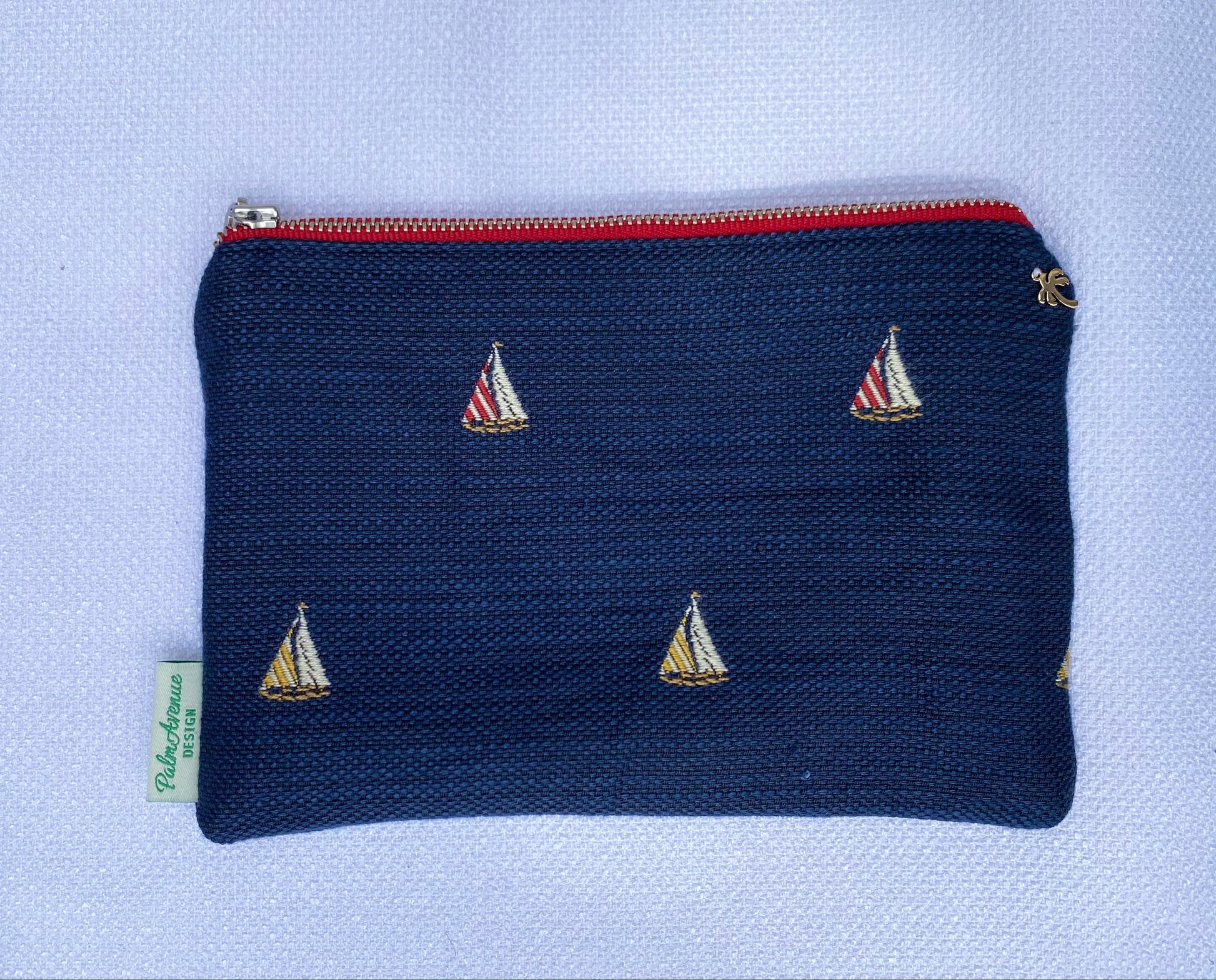 Navy clutch bag featuring cute yellow and red sailing boats, red cotton ticking lining with a matching red/silver YKK zip