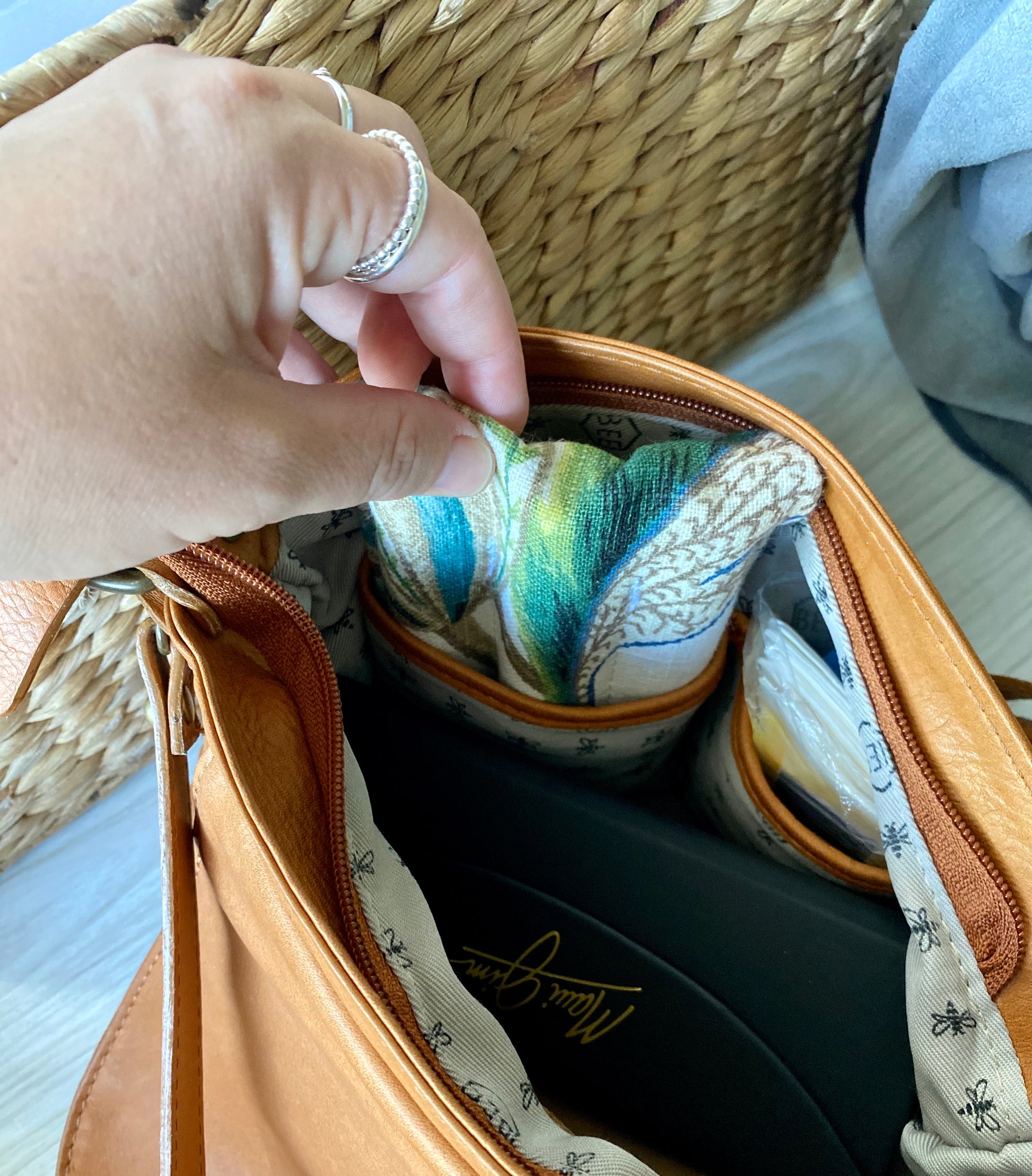 Fits perfectly in the little phone pocket most bags have (but our phones don't fit there anymore)